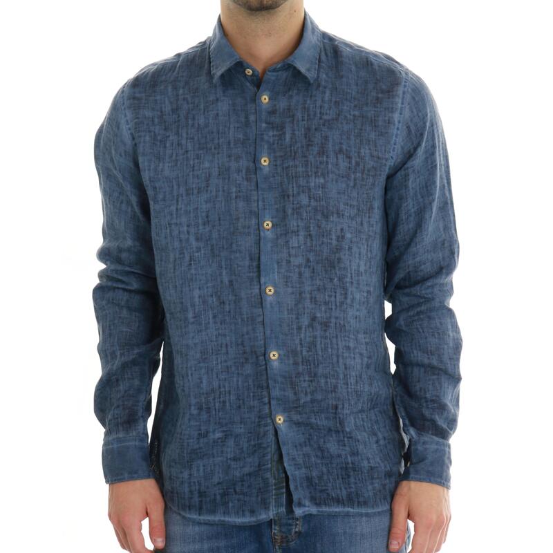 Camicia in lino effetto slavato tintura a freddo, bottoni e collo inglese, sottobottone fantasia, pinces. Vestibilità regular.