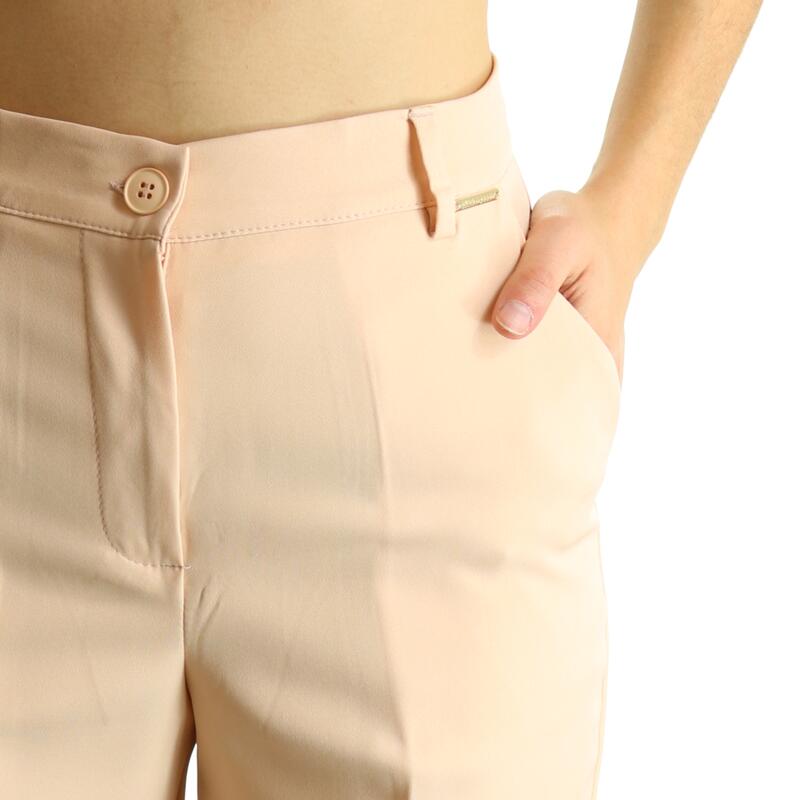 Pantalone a palazzo, vita alta, tasche america, cinturino con passanti, chiusura con bottone. Vestibilità regular.