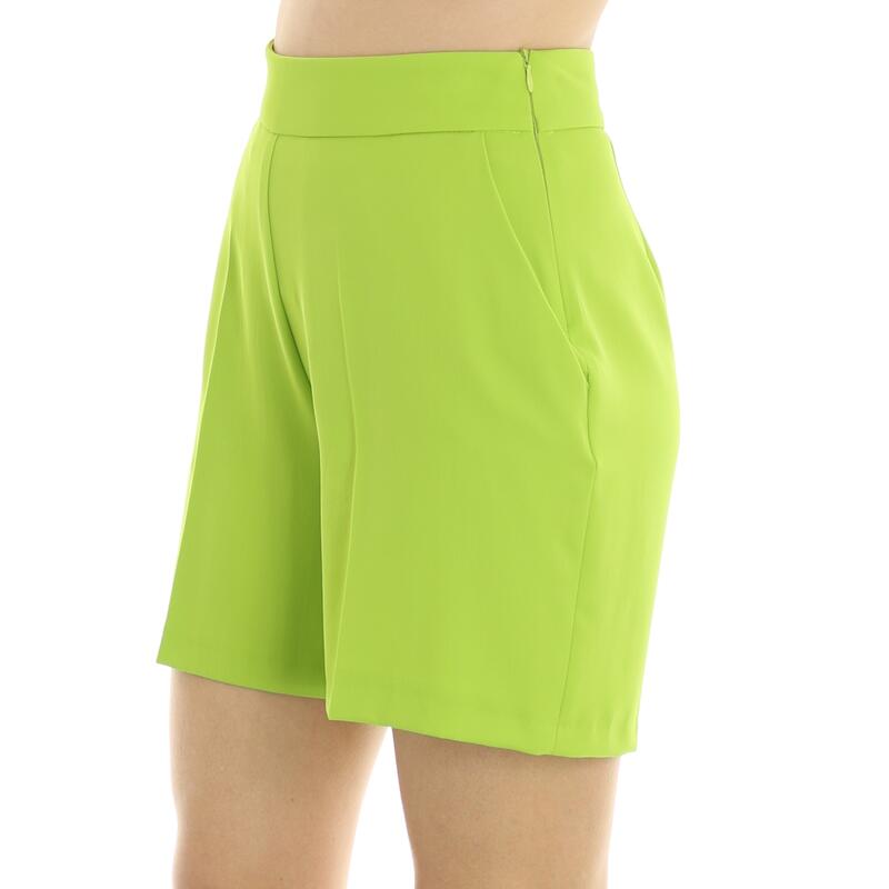 Pantalone corto in tinta unita, vita alta, chiusura con cerniera a scomparsa laterale, tasche america. Vestibilità regular.