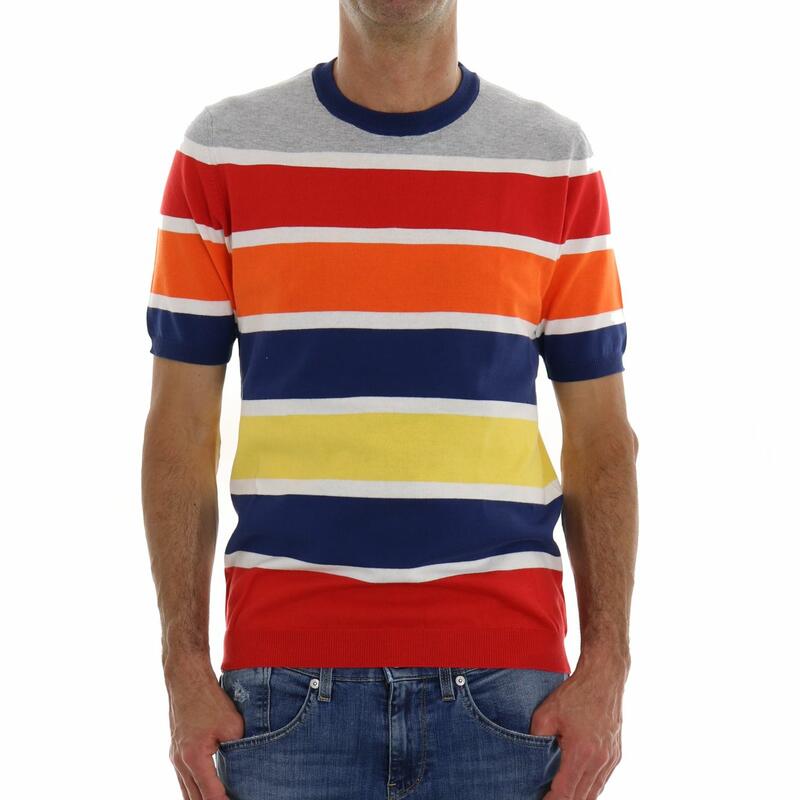Maglia girocollo, mezza manica, in fantasia righe multicolor. Vestibilità slim.