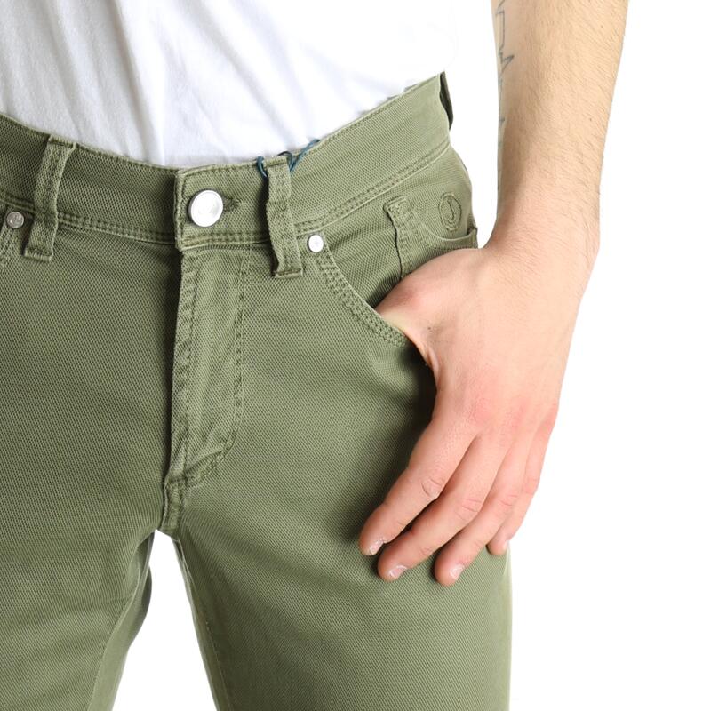 Pantalone cinque tasche in tinta unita operata, vita media, salpa a contrasto, chiusura con zip e bottone.Vestibilità slim.