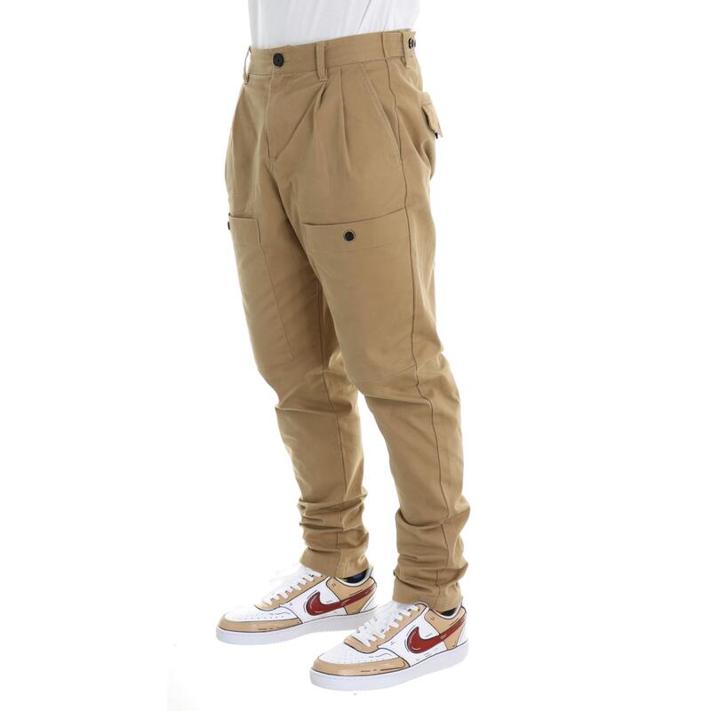 Pantalone stretch con tasconi davanti, vita media con pices, chiusura con bottone e zip. Vestibilità baggy.