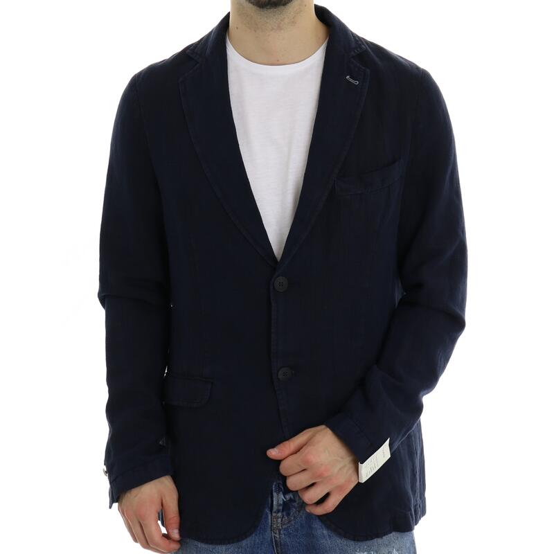 Giacca in misto lino monopetto con rever classico, due bottoni e tasche con pattina. Vestibilità slim