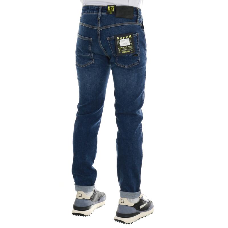 Jeans stretch lavaggio scuro, vita media, salpa a contrasto, chiusura con bottone e zip. Vestibilità slim.