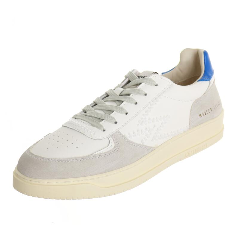 Sneakers in pelle bianca e camoscio grigio, punta traforata, logo laterale goffrato, backtab bluette, suola beige, soletta interna rialzata. Calzata regolare.