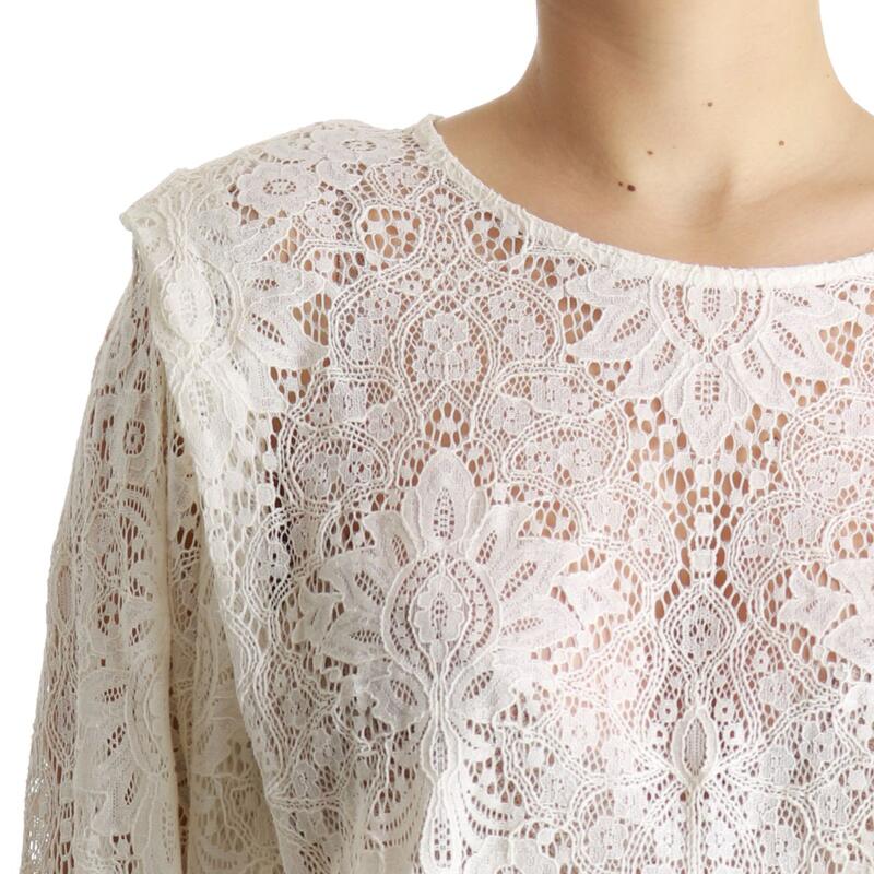Camicia in pizzo a maniche lunghe, girocolo, spalline imbottite. Vestibilità regular.
