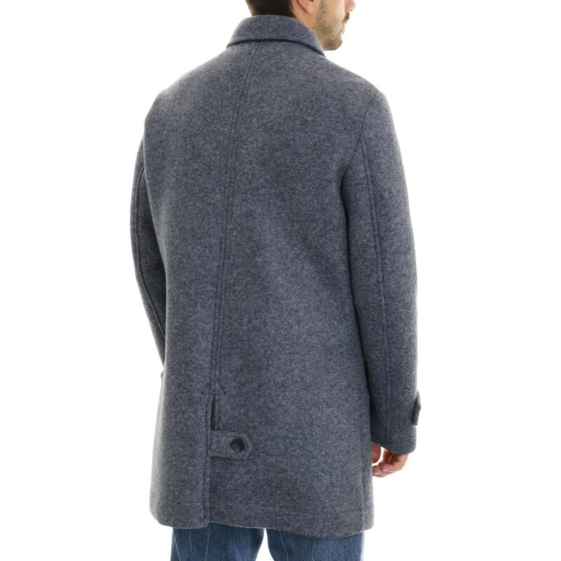 Cappotto in misto lana effetto melangiato, chiusura con zip coperta, collo inglese. Vesibilità regular.