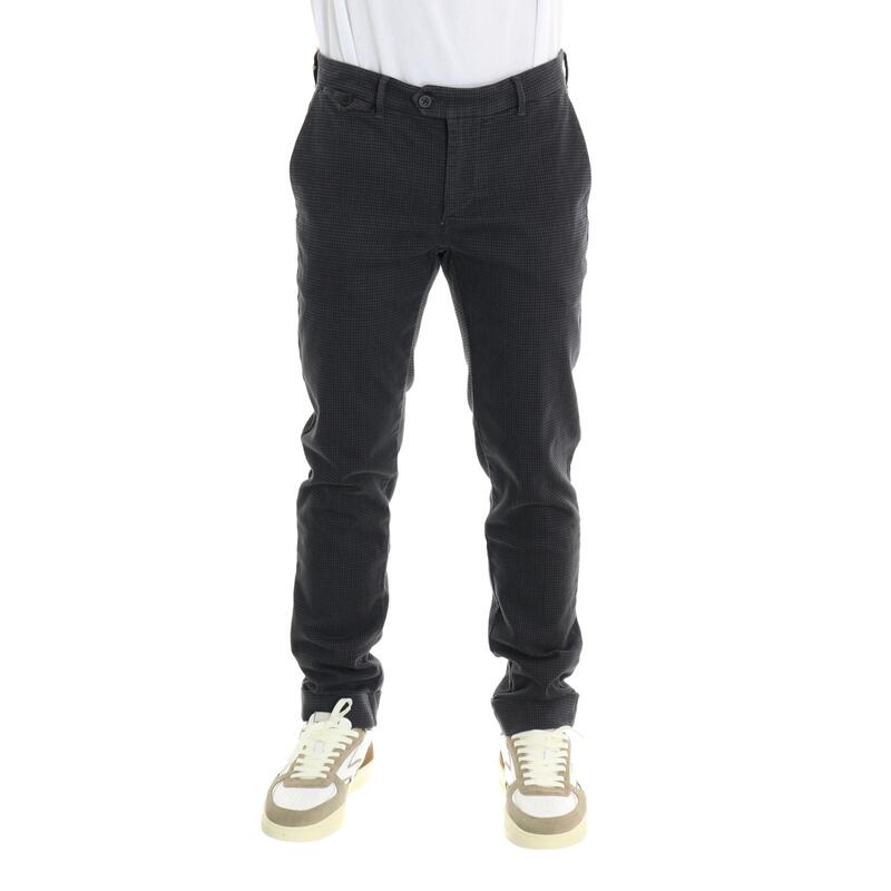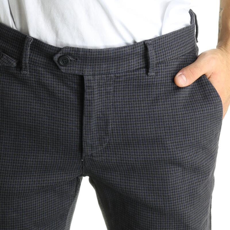 Pantalone stretch in microfantasia quadretti, vita media, tasca america, chiusura con bottone e zip, orlo con rovescia. Vestibilità slim.