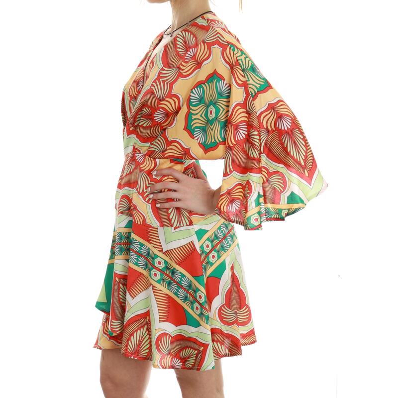 Abito manica 3/4 in fantasia geometrica, scollo a V incrociato. Vestibilità regular.