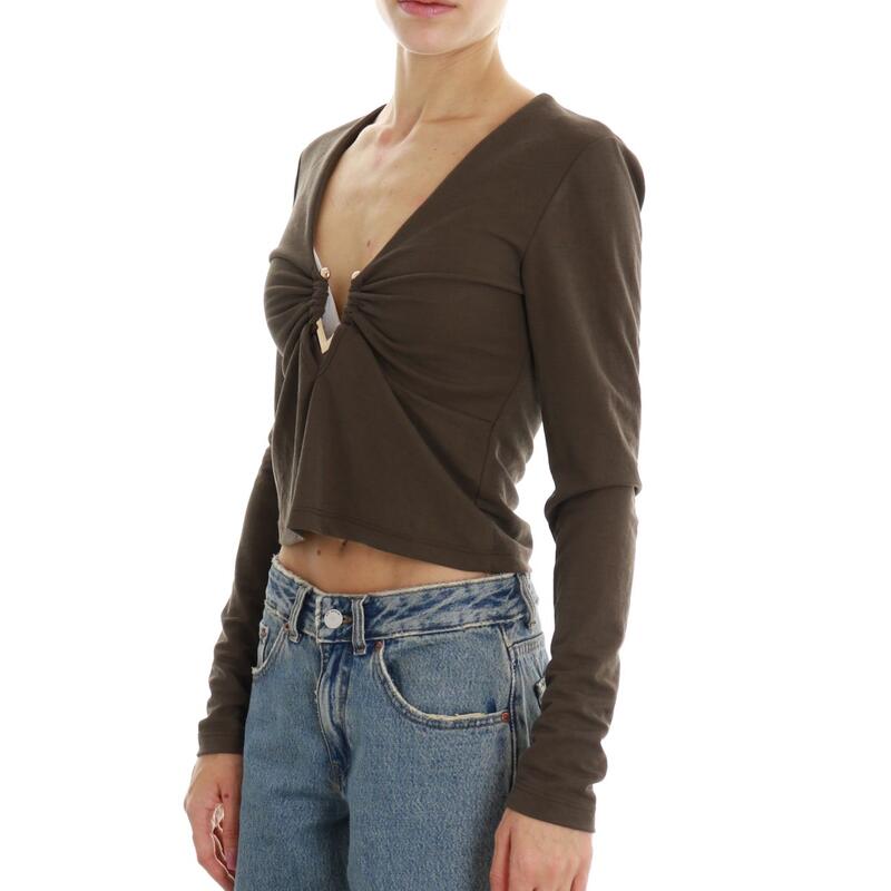 Maglietta crop a maniche lunghe con scollo a V e dettaglio metal. Vestibilità slim.