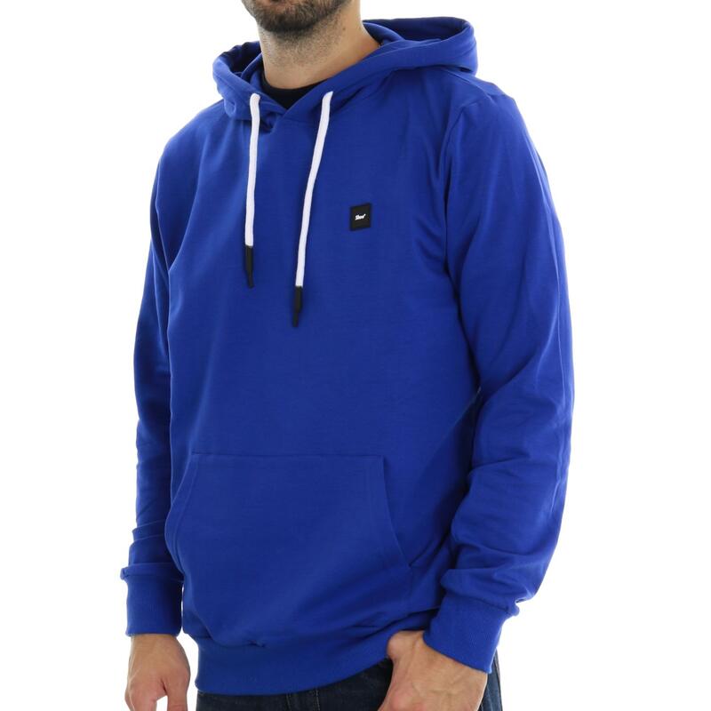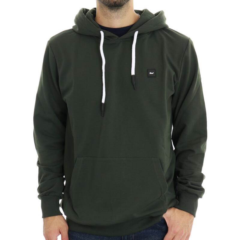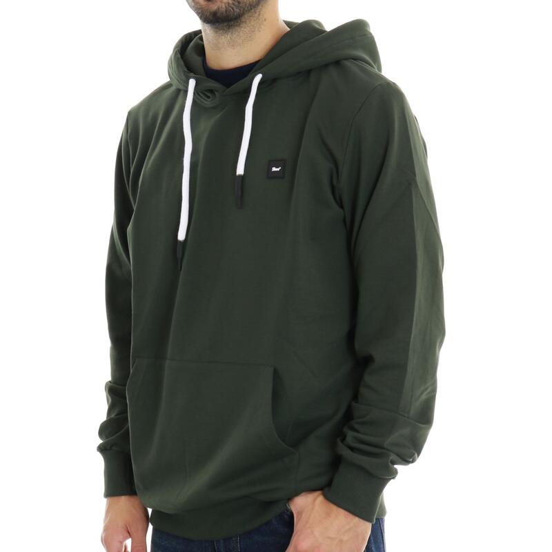Felpa chiusa con cappuccio, tinta unita, logo patch frontale. Vestibilità regular.