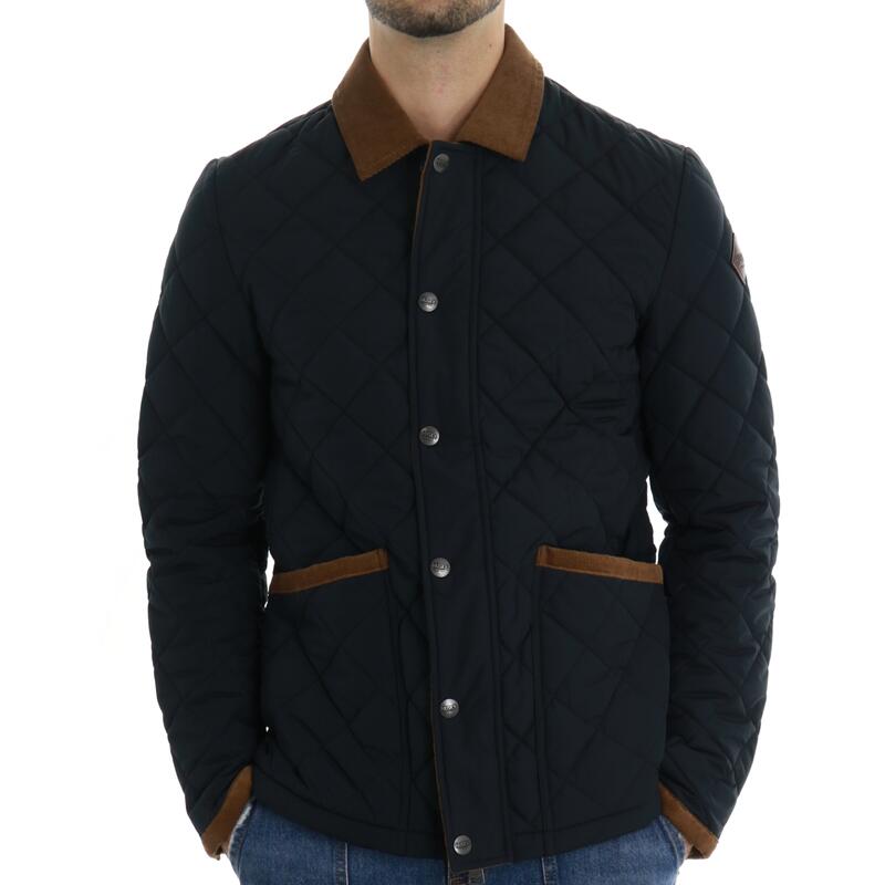 Giubbotto trapuntato, bottoni automatici e zip a scomparsa, finiture a contrasto in velluto, con tasche. Vestibilità slim.