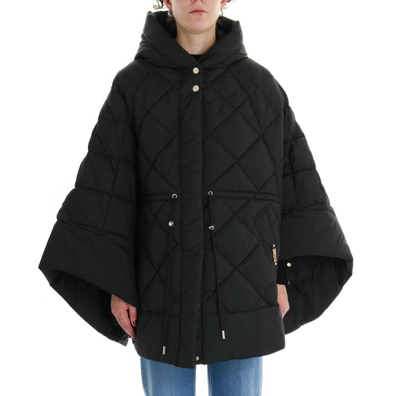 Cappa trapuntata imbottita in ecopiuma, cappuccio, tasche e coulisse in vita. Vestibilità over.