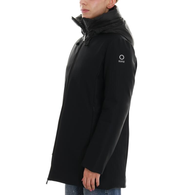 Giubbotto imbottito in ecopiuma, esterno in softshell elasticizzato, cappuccio. Vestibilità slim.