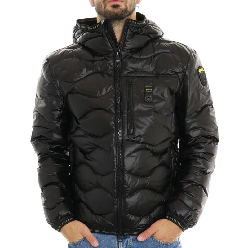Giubbotto imbottito in piuma d'oca con cappuccio fisso, filze onda, logo sulla manica in tono. Vestibilità regular.