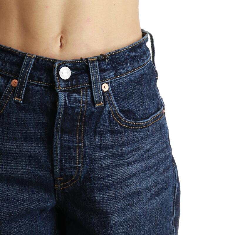 Jeans lavaggio scuro non stretch, vita alta, chiusura con bottoni, lunghezza alla caviglia. Vestibilità regular.