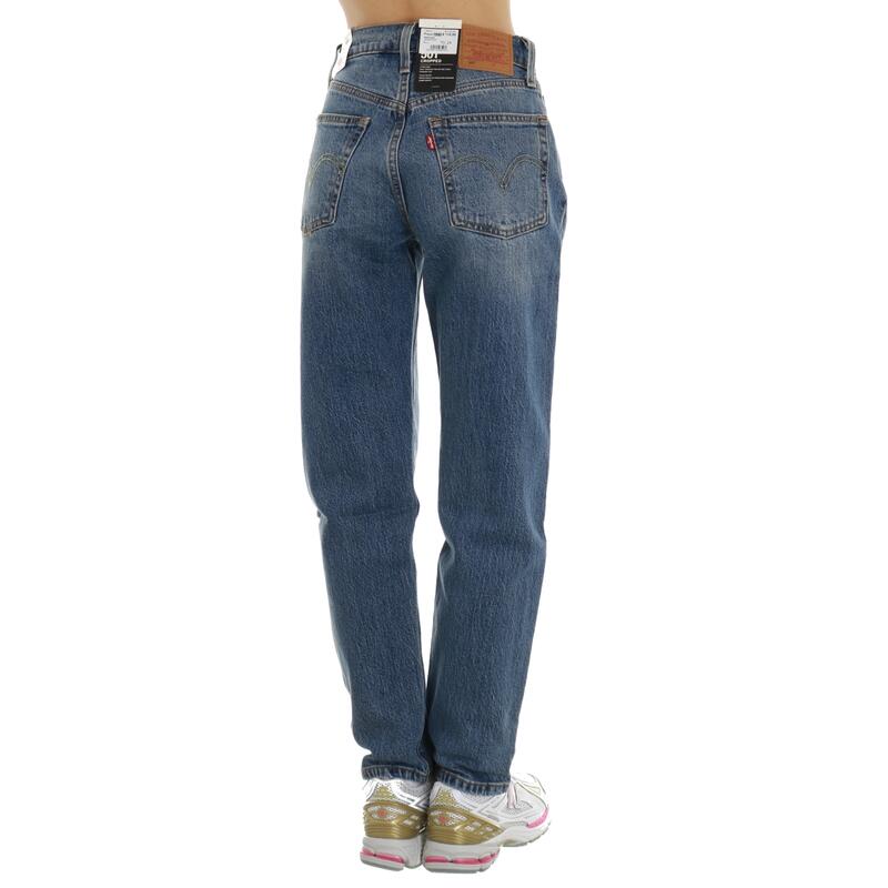 Jeans lavaggio medio non stretch, vita alta, chiusura con bottoni, lunghezza alla caviglia. Vestibilità regular.