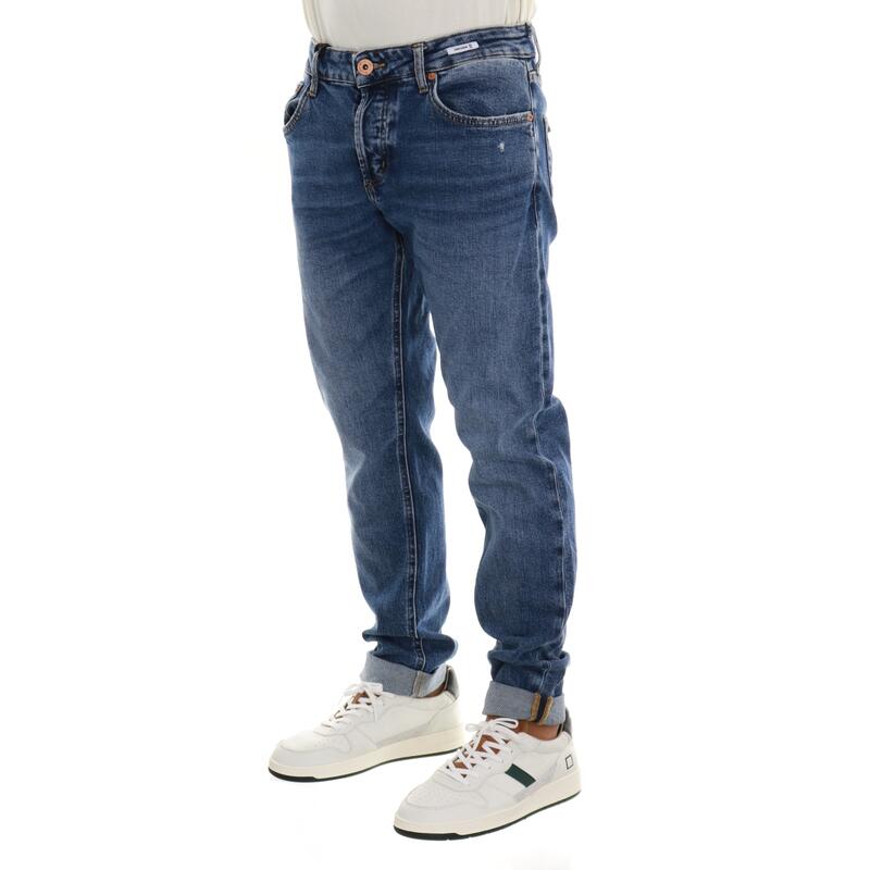 Jeans stretch slavato, vita media, salpa a contrasto, chiusura con bottone e zip. Vestibilità slim.