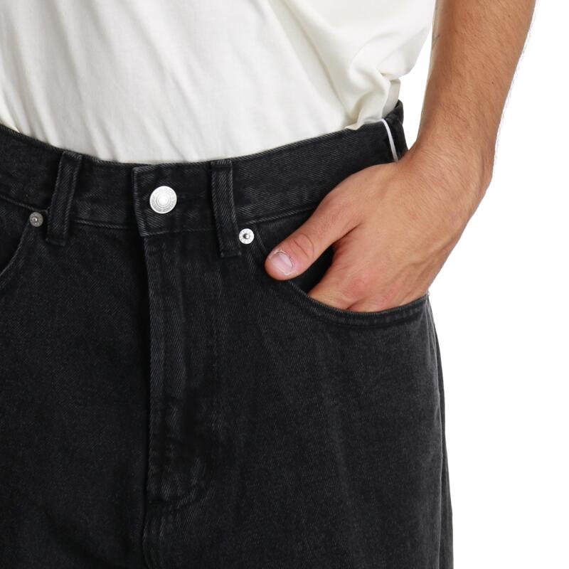 Jeans non stretch, vita calata, gamba morbida. Vestibilità over.