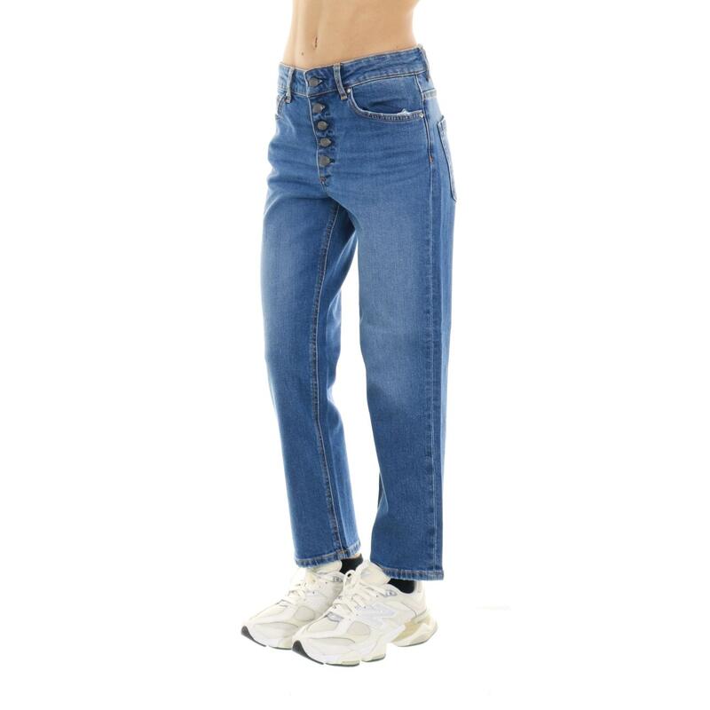Jeans stretch lavaggio scuro, vita calata con bottoni a vista. Vestibilità regular.
