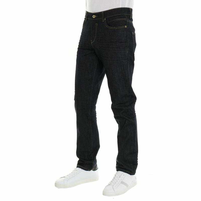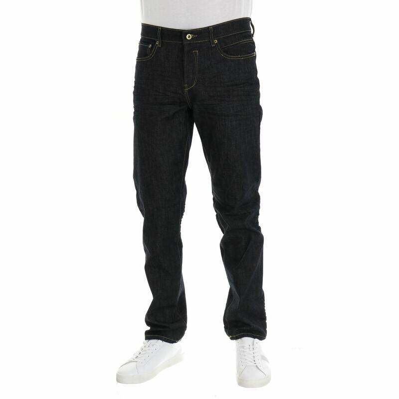 Jeans stretch, senza lavaggio, vita media, chiusura con bottone e zip. Vestibilità regular.