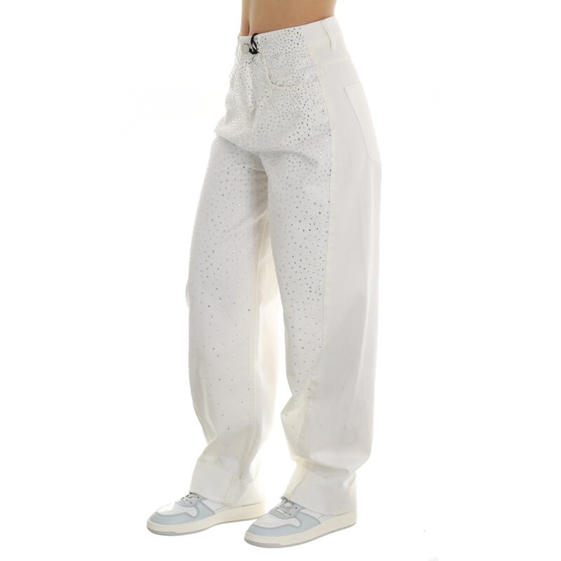 Jeans bianco non stretch con strass applicati sul davanti, vita media, chiusura con bottone e zip, orlo con rovescia taglio vivo. Vestibilità regular.