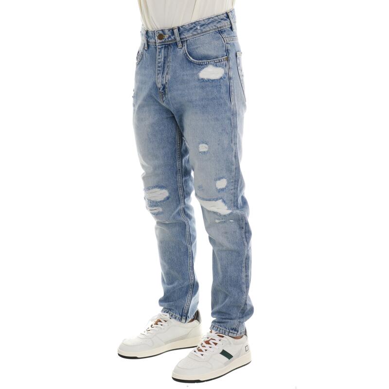 Jeans non stretch slavato, vita media, cavallo calato, con rotture. Vestibilità cropped.