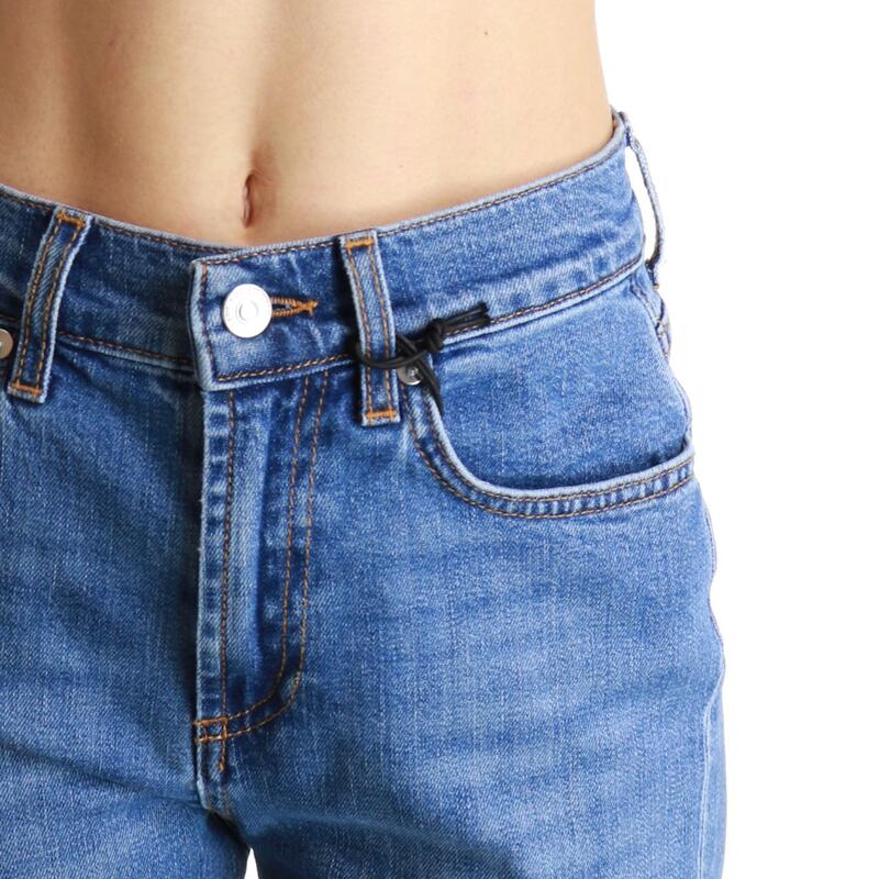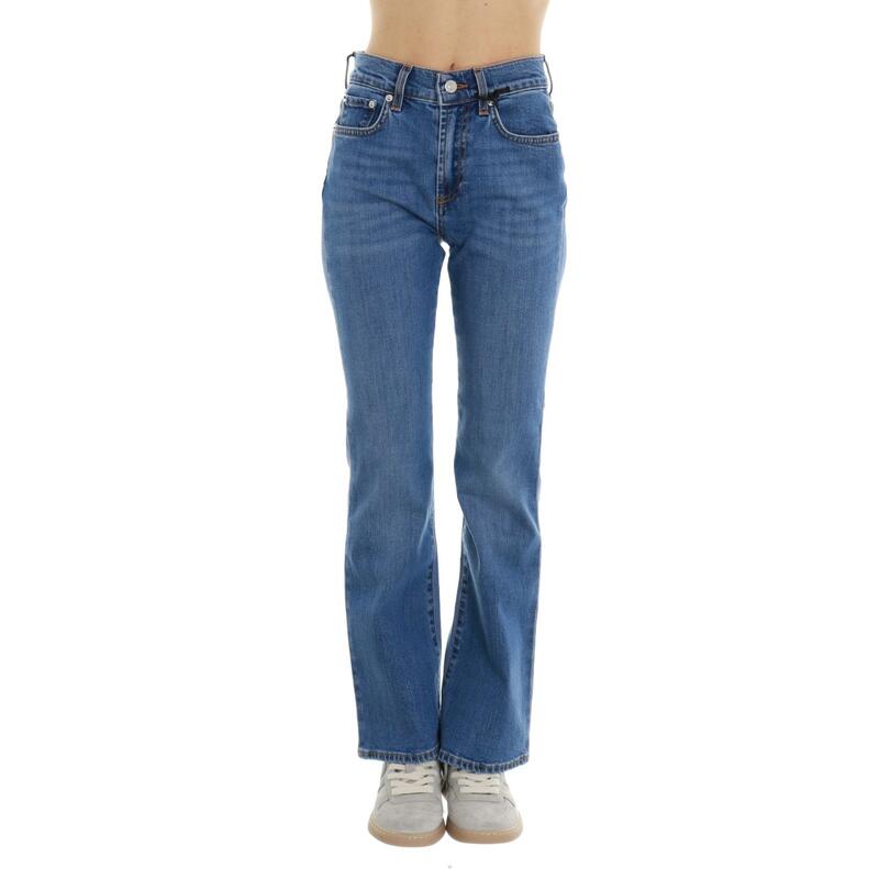 Jeans stretch lavaggio intermedio, a trombetta, vita alta, chiusura con bottone e zip. Vestibilità regular.