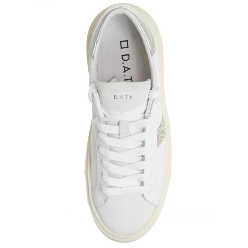 Sneakers in pelle laminata, linguetta in pelle con logo D.A.T.E. impresso e lacci in cotone. Il logo quadrato e il nome del modello sono impressi lateralmente. Talloncino posteriore in pelle bianca e suola platform alta 4-5 cm. Calzata regolare.