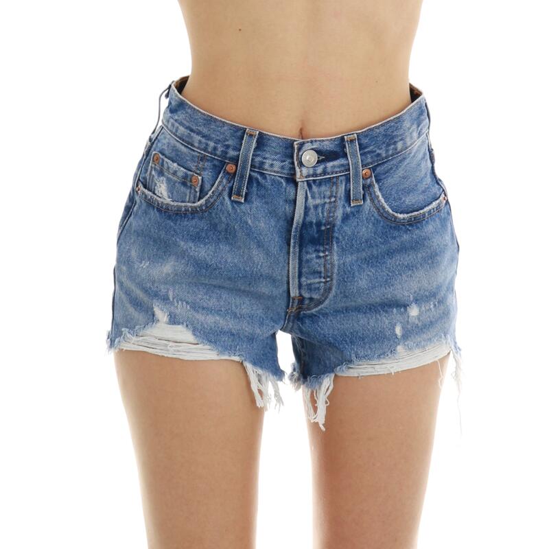 Jeans corto, vita alta, slavato, orlo taglio vivo, salpa a contrasto, chiusura con bottoni. Vestibilità slim.
