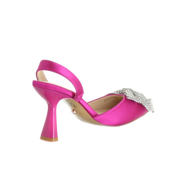 Slingback in ecopelle cracklè con applicazione a forma di fiocco in strass e tacco a rocchetto alto 10,5cm. Calzata regolare.