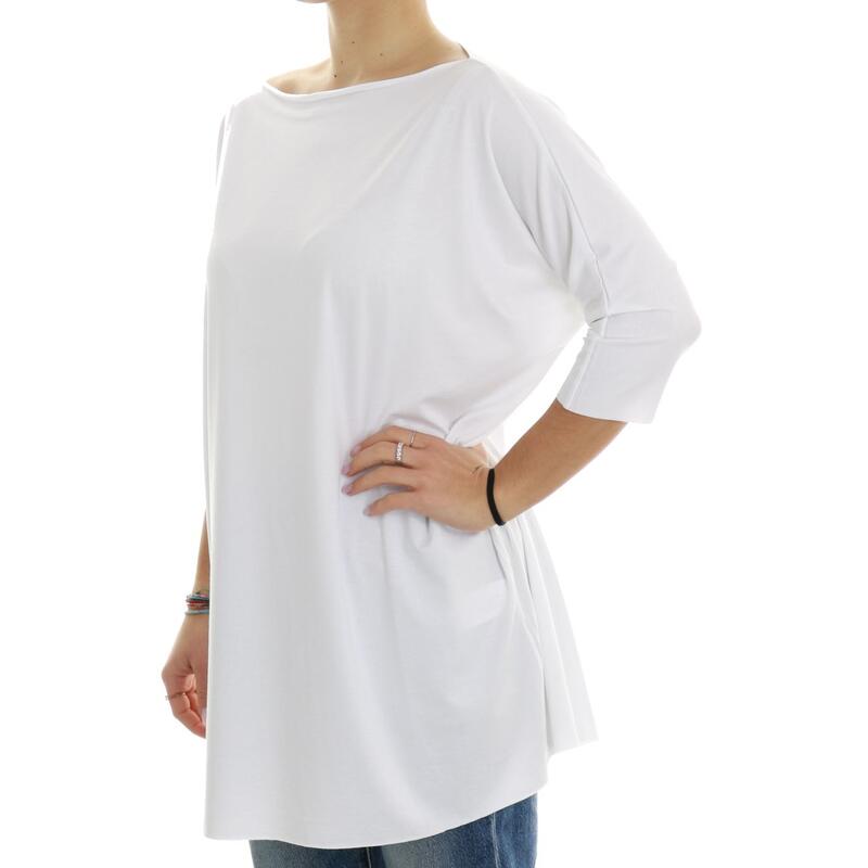 Maxi t-shirt manica 3/4 scollo a barca, taglio vivo. Vestibilità regular.