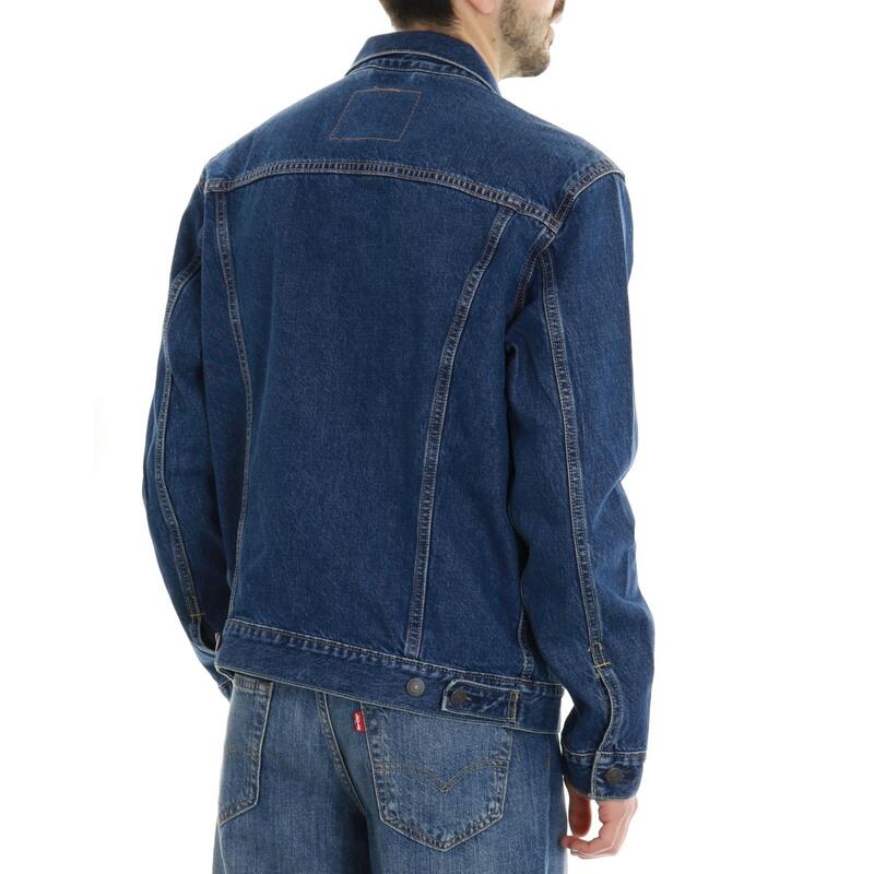 Giubbotto in jeans lavaggio scuro, bottoni frontali, collo camicia, tasche a toppa con mini logo ricamato. Vestibilità regular.